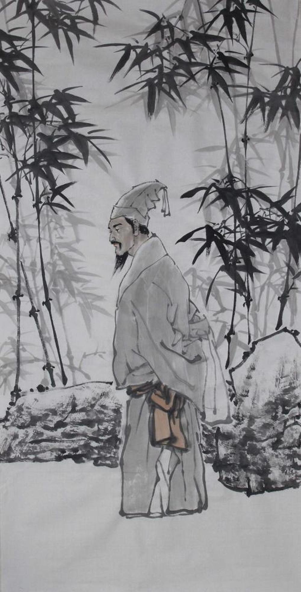 作品主要描绘的是一位古代的文人正在一片竹子前思考,寻找灵感的情景。